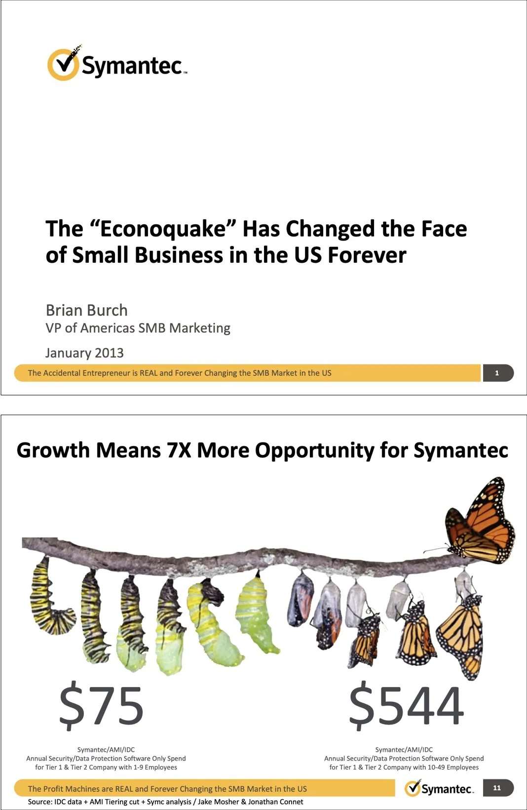 2. 268,000 US SMB customers of Norton were leaving each year because they had outgrown Norton and didn’t know how to graduate to Symantec (many didn’t know Norton and Symantec were the same company). This represented lost revenue of ~$20M (268,000 X $75) annually.